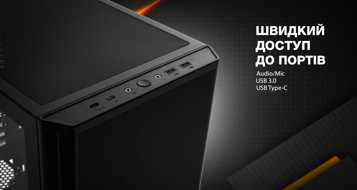 На передній панелі корпусу розміщені зручні роз'єми для зовнішніх пристроїв. Ви зможете підключити свої USB-пристрої завдяки роз'ємам USB 3.0 та USB Type-C насолоджуватись якісним звуком завдяки аудіо роз'ємам. Такий функціонал дозволить легко збільшити продуктивність і зручність роботи.