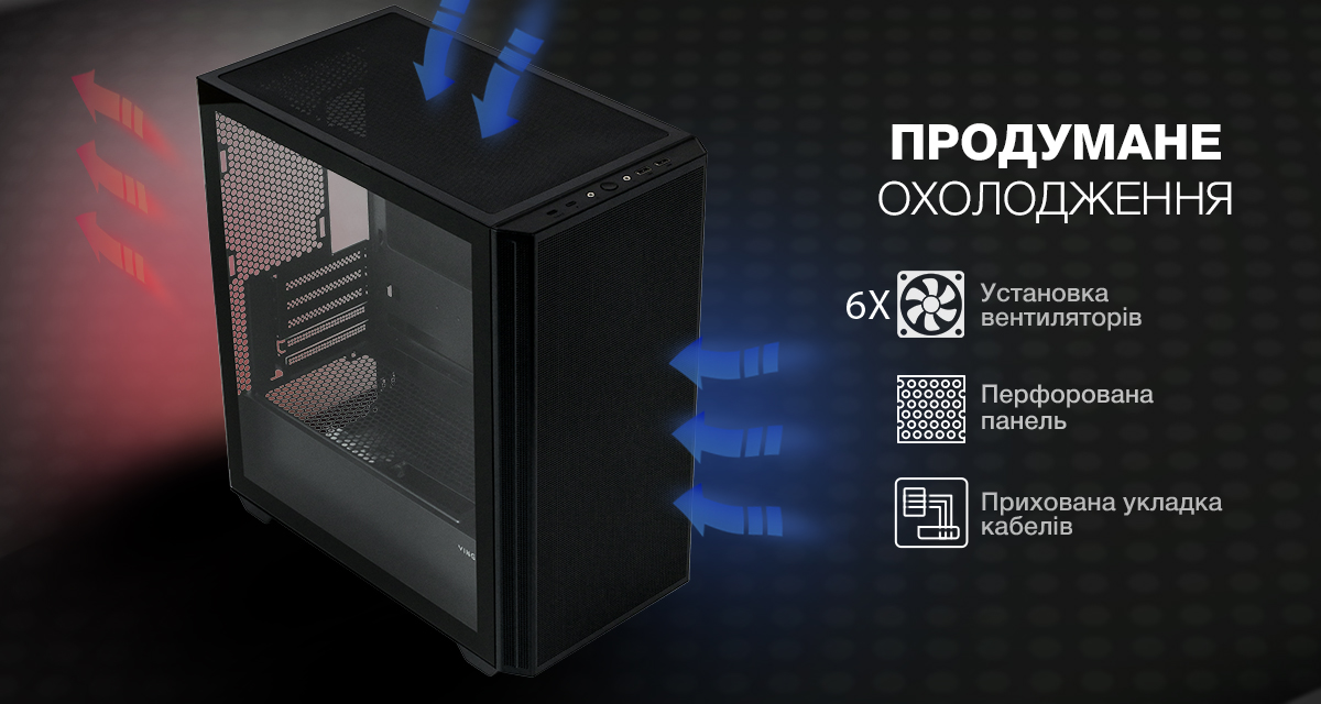 Vinga Cello має продуману систему охолодження, що забезпечує стабільну температуру компонентів під час інтенсивної роботи. Є можливість встановлення до 6-ти вентиляторів. Вентиляційні отвори на боковинах та перфорована поверхня допомагають забезпечити ефективне розподілення потоку повітря. Однією з ключових переваг нового корпусу є можливість прихованої укладки кабелів без зайвих зусиль.