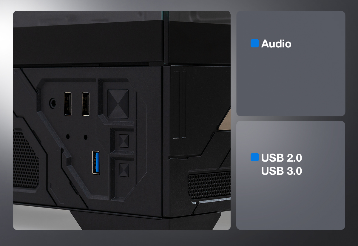 Корпус Vinga Contact створений для того, щоб ви могли демонструвати свою збірку у всій красі. Завдяки прозорій передній панелі та великому оглядовому вікну на бічній грані, внутрішні компоненти системи, особливо з RGB-підсвічуванням, виглядають неймовірно ефектно. Це перетворює ваш ПК на справжній арт-об'єкт. Для максимальної зручності користувача на верхню або передню панель винесено всі необхідні інтерфейси: аудіо-роз'єми для навушників та мікрофона, а також порти USB 2.0 та швидкісний USB 3.0, що дозволяє швидко підключати периферію та зовнішні накопичувачі без необхідності тягнутися до задньої стінки.