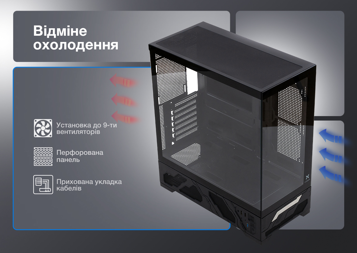 Ефективний рух повітря — запорука довговічності комплектуючих, і Vinga Contact справляється з цим завданням на відмінно. Корпус обладнано посадковими місцями для встановлення до 9 додаткових вентиляторів, а перфоровані поверхні сприяють природній циркуляції повітря. Нижнє розташування блока живлення не лише покращує стійкість корпусу, але й оптимізує теплообмін, забираючи холодне повітря знизу. Окремої уваги заслуговує система прихованої укладки кабелів: вона дозволяє акуратно сховати всі дроти за задньою стінкою, що не тільки покращує естетику, але й не перешкоджає вільному проходженню повітряних потоків всередині системи.