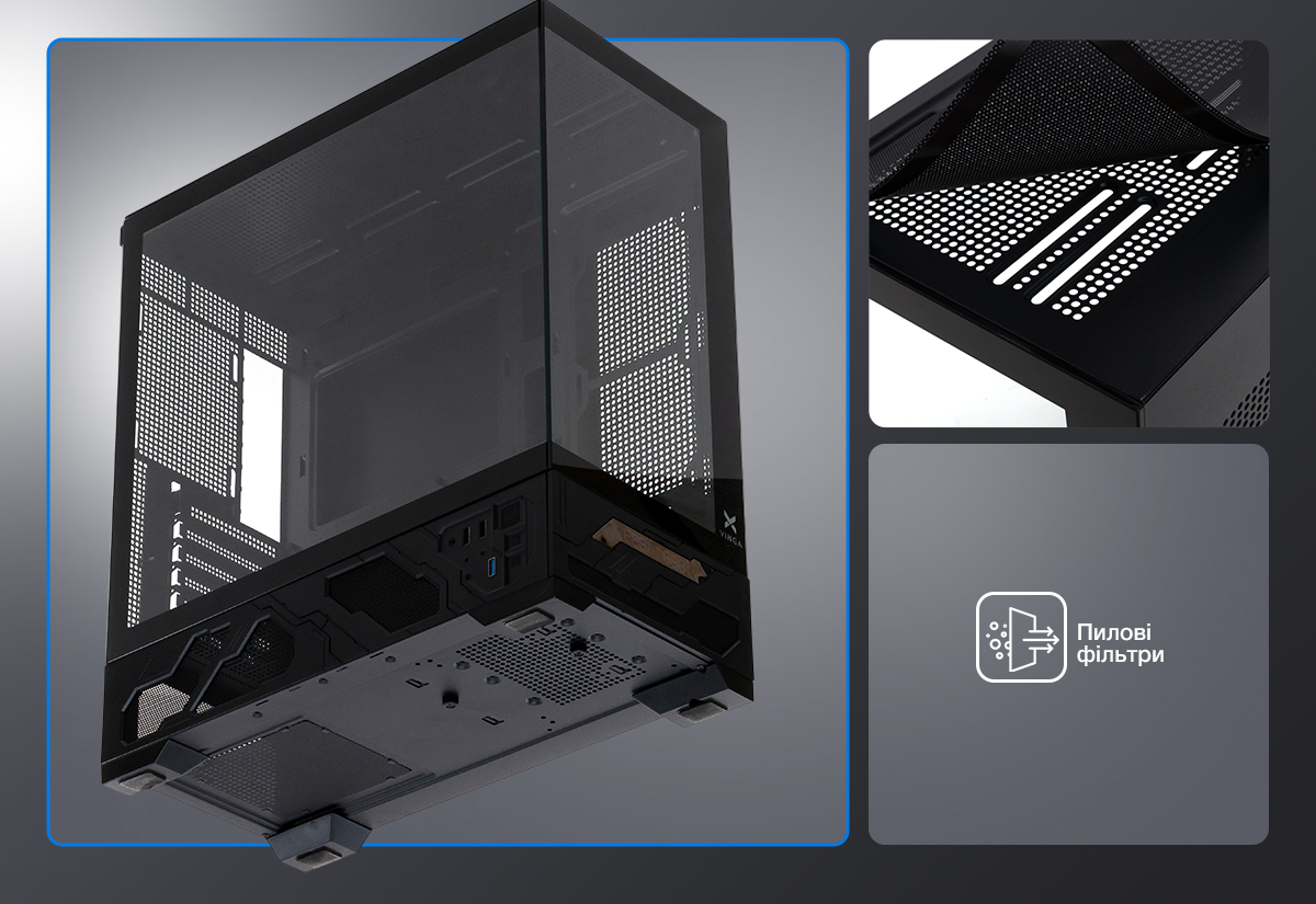 Інженери Vinga подбали про те, щоб збірка та експлуатація комп'ютера були максимально комфортними. Внутрішній простір корпусу добре продуманий, забезпечуючи легкий доступ до всіх вузлів системи під час монтажу або апгрейду. Важливим елементом конструкції є наявність спеціального пилового фільтра. Він надійно захищає внутрішні компоненти від накопичення пилу та бруду, що є критично важливим для стабільної роботи електроніки. Це значно спрощує обслуговування ПК та подовжує термін служби вентиляторів і радіаторів, зберігаючи їх ефективність на високому рівні протягом тривалого часу.