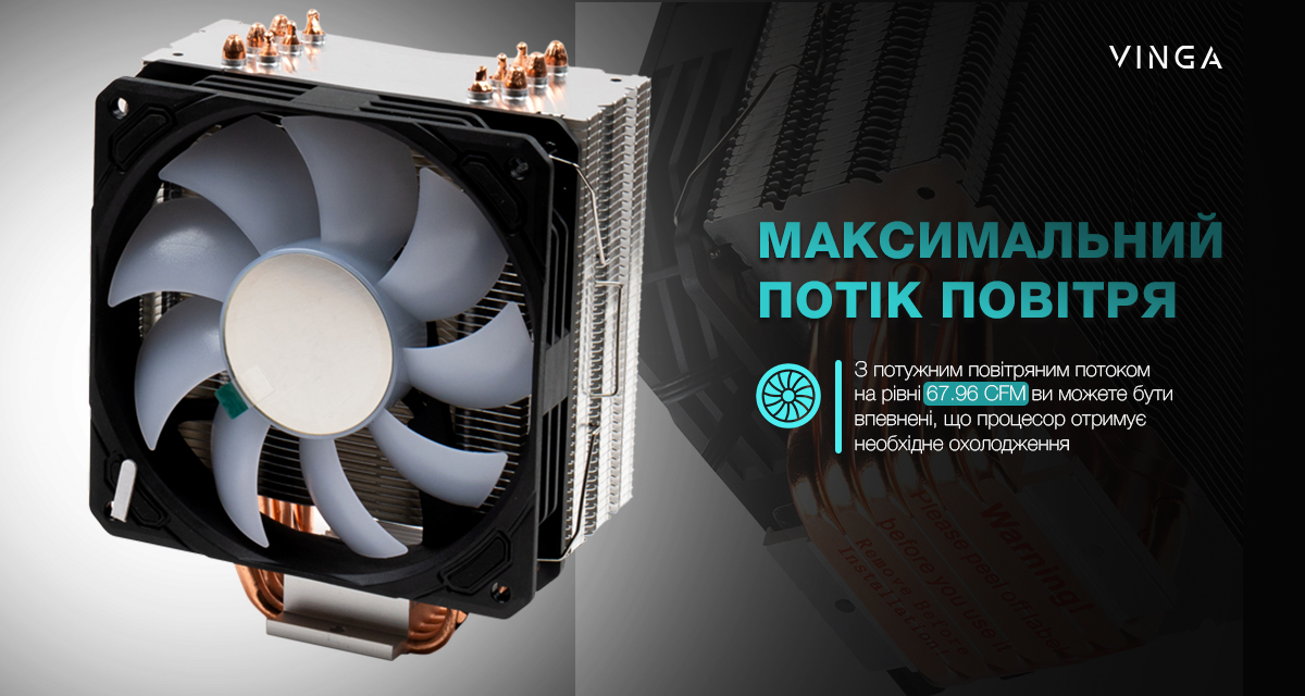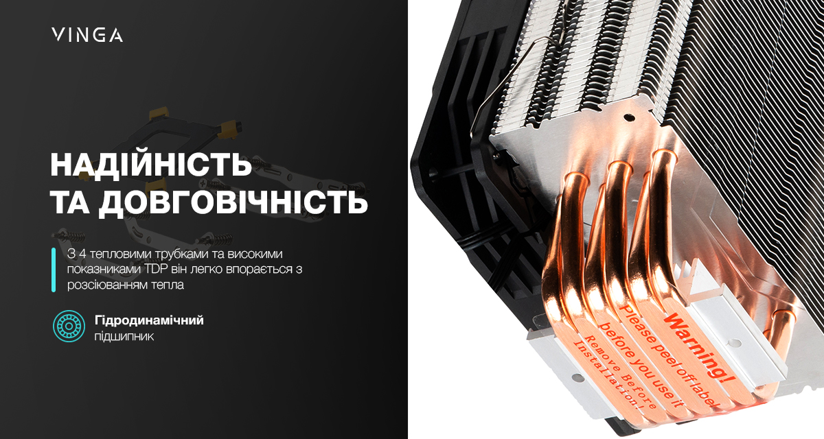 Оснащений гідродинамічним підшипником і виготовлений із якісних матеріалів, Vinga CL3012 гарантує стабільну роботу протягом тривалого часу. Завдяки 6 тепловим трубкам кулер ефективно розсіює тепло, підтримуючи показник TDP до 160 Вт, навіть у найскладніших умовах роботи.