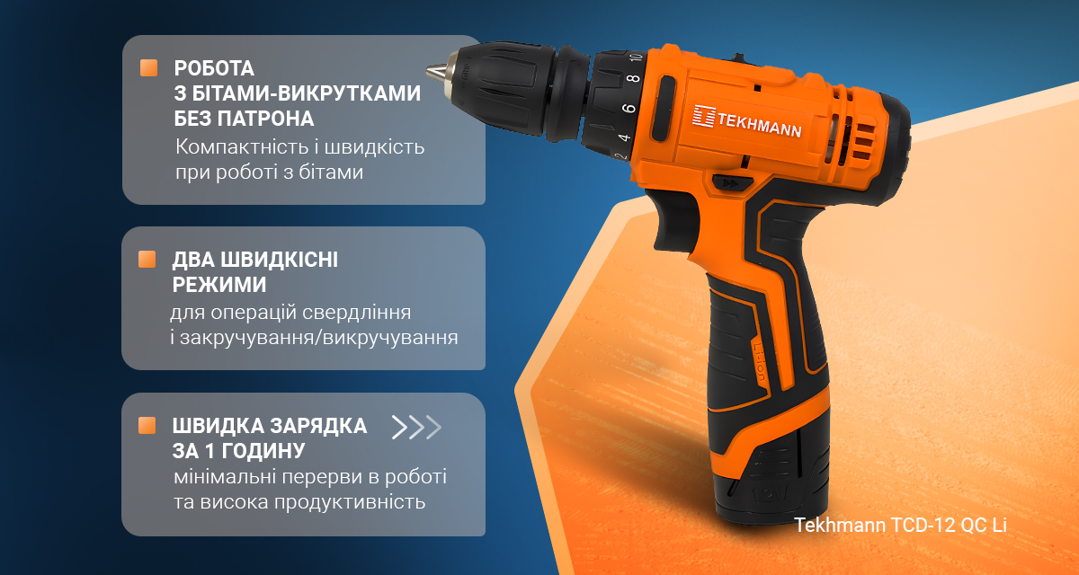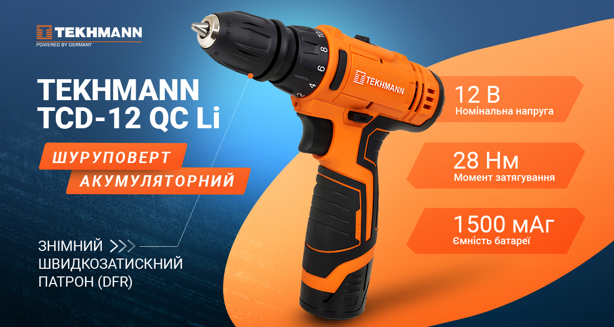 Опис Шуруповерт Tekhmann TCD-12 QC Li с 1 АКБ (853461)