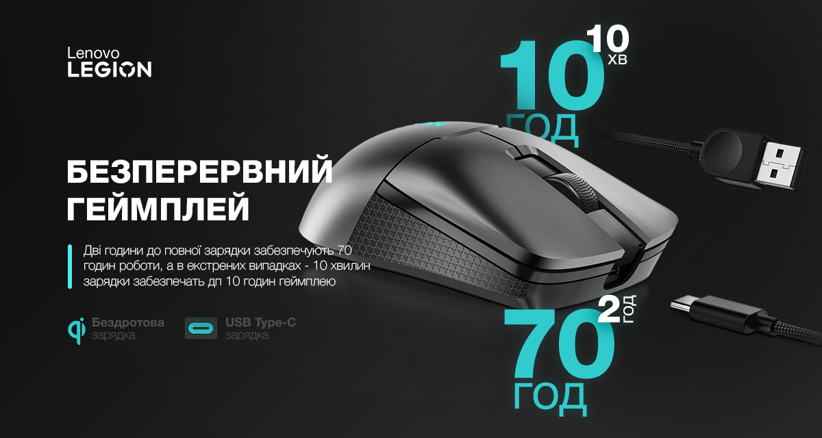 Мишку можна заряджати або через кабель USB-C, або з допомогою бездротової зарядки Qi. Зарядіть мишку всього за дві години і вона працюватиме понад 70 годин. А якщо вам потрібно швидко повернутися до гри, лише 10 хвилин зарядки забезпечать ще 10 годин геймплею! Тепер ви завжди готові до нових викликів у вашій грі!