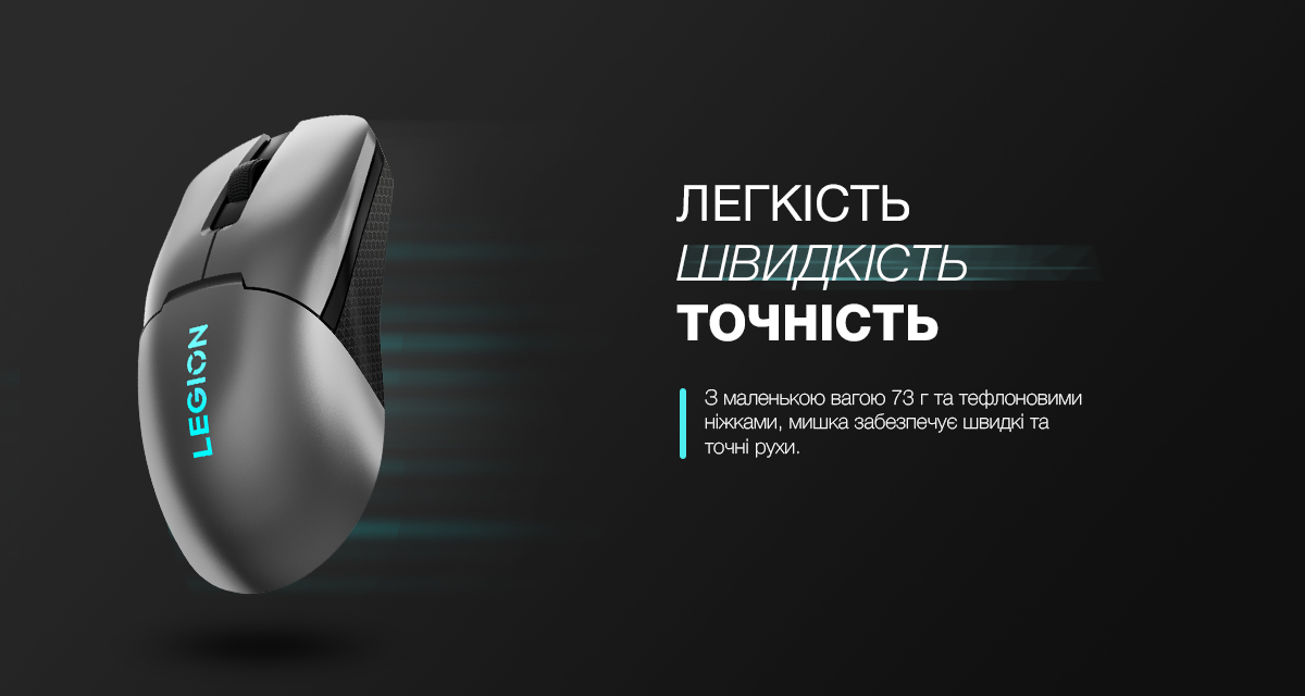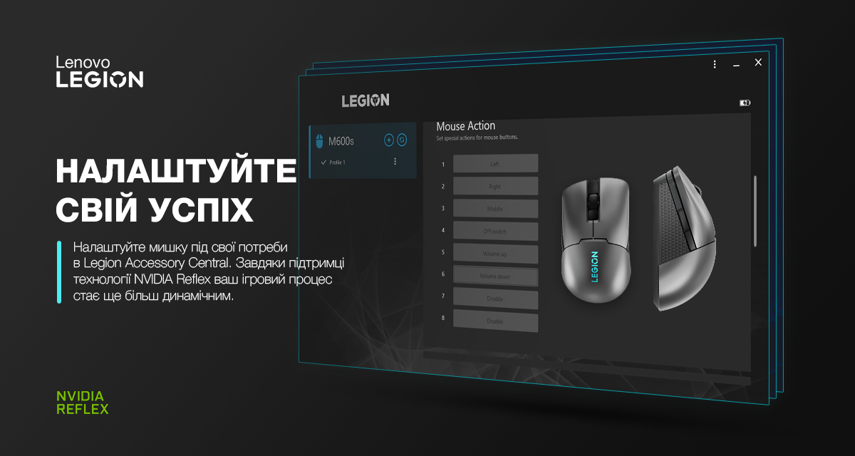Забезпечте собі перевагу на полі бою з функцією сумісності з NVIDIA Reflex. Завдяки цій технології ваш ігровий процес стає ще більш динамічним і реагує на ваші рухи миттєво, дозволяючи вам блискавично реагувати на будь-які ситуації. А з повною персоналізацією, доступною завдяки Legion Accessory Central, ви зможете налаштувати мишку до власних потреб і створити ідеальне ігрове середовище, яке підходить саме вам.
