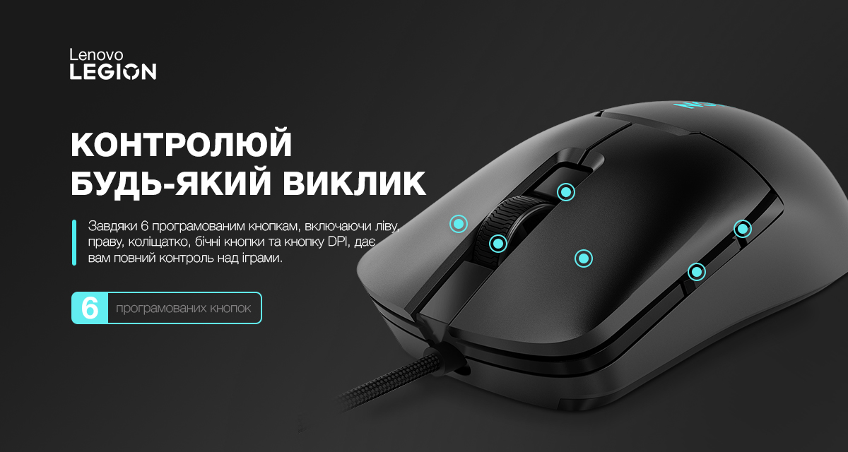 Завдяки 6 програмованим кнопкам, включаючи ліву, праву, коліщатко, бічні кнопки та кнопку DPI, Lenovo Legion M300s дає вам повний контроль над іграми. Використовуйте функцію перемикання DPI “на льоту”, щоб швидко налаштувати ігрові параметри та отримати перевагу над суперником.
