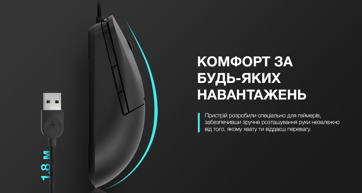 Пристрій розробили спеціально для геймерів, забезпечивши зручне розташування руки незалежно від того, якому хвату ти віддаєш перевагу. Підключай мишу через USB-роз’єм, кабель довжиною 1,8 м дасть змогу зручно використовувати її з ноутбуком або десктопом.