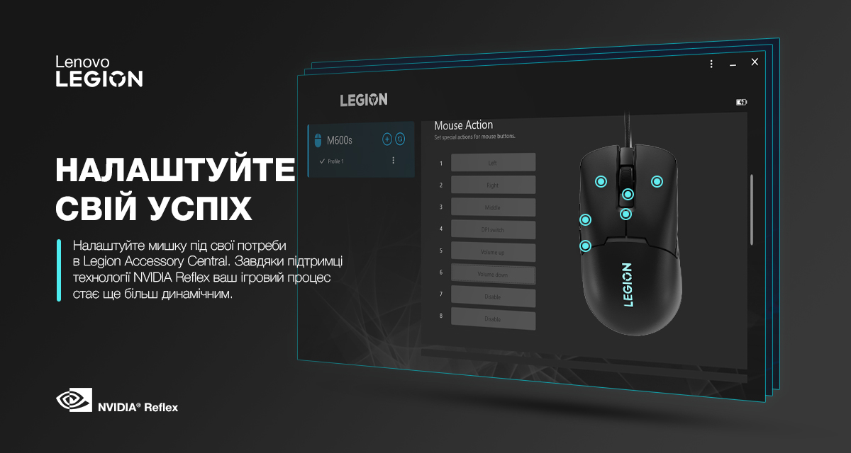 Забезпечте собі перевагу на полі бою з функцією сумісності з NVIDIA Reflex. Завдяки цій технології ваш ігровий процес стає ще більш динамічним і реагує на ваші рухи миттєво, дозволяючи вам блискавично реагувати на будь-які ситуації. А з повною персоналізацією, доступною завдяки Legion Accessory Central, ви зможете налаштувати мишку до власних потреб і створити ідеальне ігрове середовище, яке підходить саме вам.