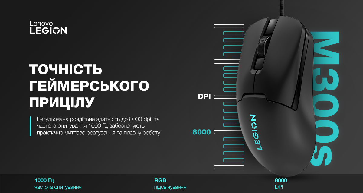 Миша Lenovo Legion M300s RGB Gaming Mouse з прицільною чіткістю кожного кліка створена в максимальній відповідності до потреб геймерів. Регульована роздільна здатність сягає 8000 dpi, а частота опитування — 1000 Гц. Такі параметри забезпечують практично миттєве реагування аксесуара та плавну роботу. Стильне світлодіодне RGB-підсвічування логотипа дасть змогу створити відповідну атмосферу.