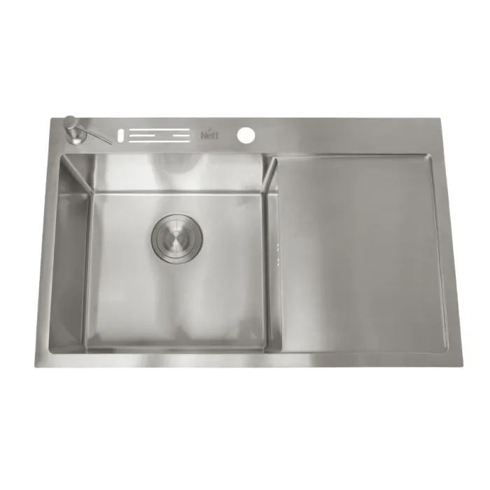 Мийка з бічним крилом виготовлена з преміальної нержавіючої сталі AISI 304. Вміст хрому та нікелю в цій сталі вище, ніж у AISI 204, що забезпечує чудові експлуатаційні якості.