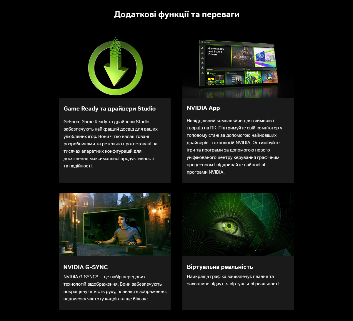 Game Ready та драйвери Studio. GeForce Game Ready та драйвери Studio забезпечують найкращий досвід для ваших улюблених ігор. Вони чітко налаштовані розробниками та ретельно протестовані на тисячах апаратних конфігурацій для досягнення максимальної продуктивності та надійності.