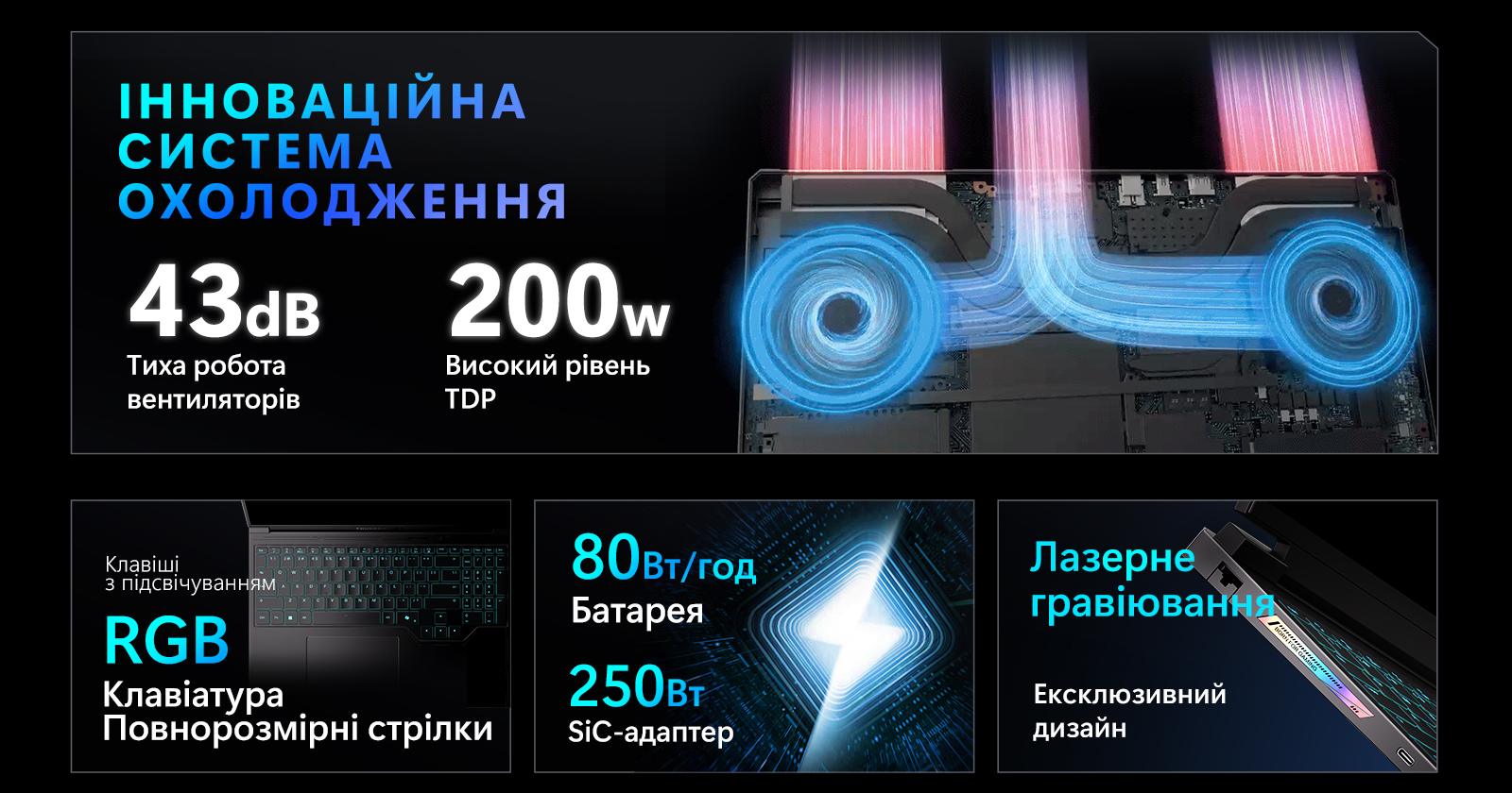 Ігровий ноутбук Thunderobot RS16 створений для справжніх ентузіастів, які цінують ефективність, дизайн і тишу. Його інноваційна система охолодження забезпечує відведення тепла на рівні до 200 Вт TDP, при цьому залишаючись надзвичайно тихою — лише 43 дБ. Це означає комфортну роботу навіть у найнапруженіших ігрових сесіях або при рендерингу. Повнорозмірна клавіатура з RGB-підсвічуванням та великими стрілками дарує зручність як у грі, так і в роботі. Акумулятор ємністю 80 Вт/год забезпечує тривалу автономність, а компактний адаптер SiC на 250 Вт дозволяє швидко заряджати пристрій. Дизайн доповнює ексклюзивне лазерне гравіювання, яке підкреслює преміальність серії RS16 та додає індивідуальності кожному пристрою.