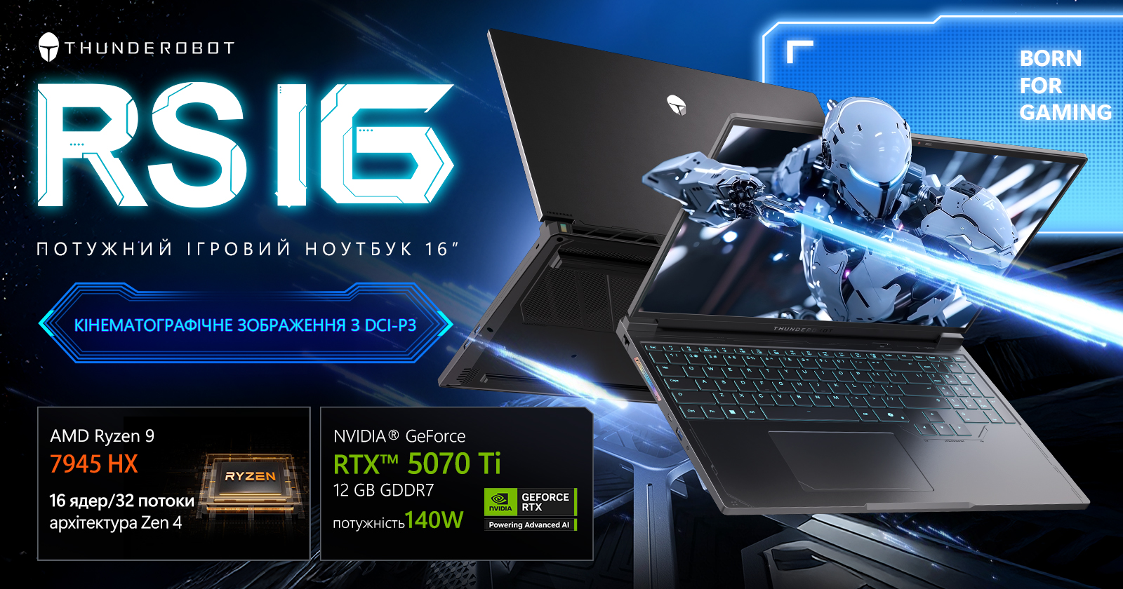 Ігровий ноутбук Thunderobot RS16 створений для тих, хто очікує максимум від продуктивності та графіки. Його серцем є флагманський процесор AMD Ryzen 9 7945HX (2.5 - 5.4 ГГц) — це гарантія блискавичної обробки даних у багатозадачних сценаріях, складному рендерингу та AAA-іграх. За графіку відповідає новітня відеокарта NVIDIA GeForce RTX 5070 Ti з 12 ГБ ультрашвидкої відеопам’яті GDDR7. Вона підтримує максимальне енергоспоживання 140 Вт, що дозволяє використовувати всі можливості штучного інтелекту, трасування променів та DLSS 4 на повну. Візуальні ефекти будуть не лише реалістичними, а й плавними навіть у найвибагливіших іграх. Окремої уваги заслуговує екран із високою точністю передачі кольору (DCI-P3), що робить ноутбук чудовим варіантом також для дизайнерів, відеомонтажерів і креаторів контенту.