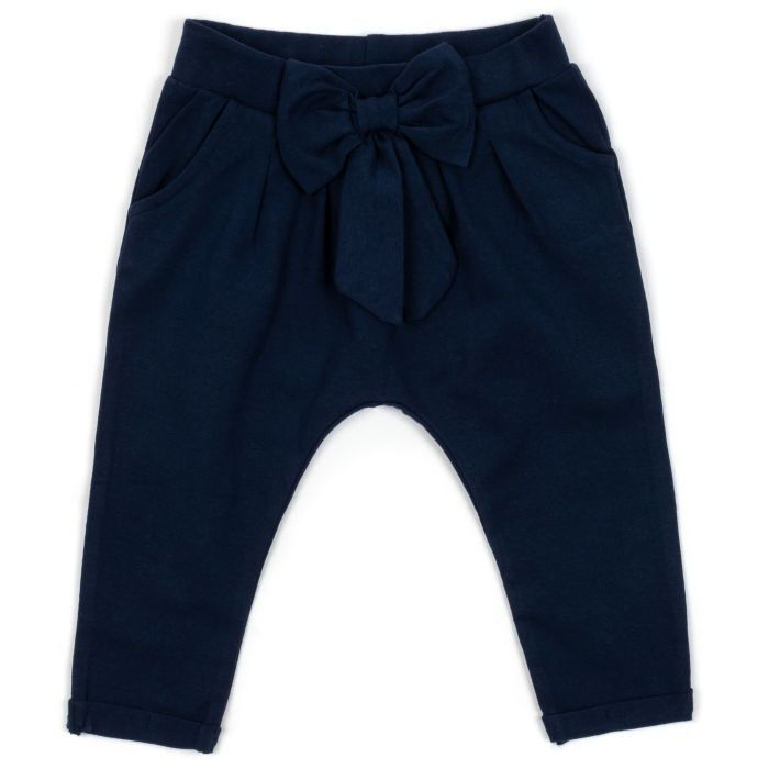Зверху штани вільні - спереду без середнього шва і в поясі зібрані складками, до низу - завужені. Прикрашені об'ємним трикотажним пришитим бантом. Еластичний трикотажний пояс, посилений додатково вставленою широкою «гумкою», забезпечить дитині повну свободу рухів і оптимальну посадку по фігурі.