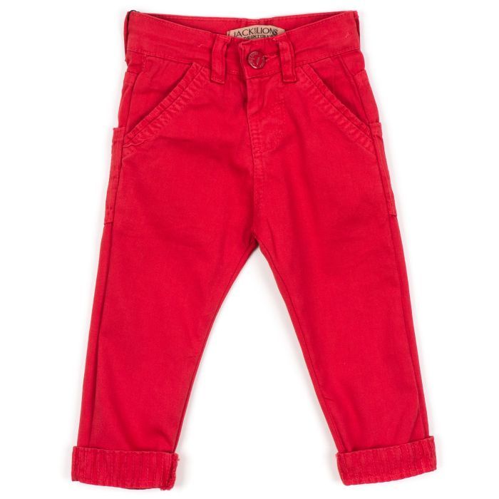- Зручні дитячі стрейчеві бавовняні штани червоного кольору, з кишенями та підгорнутими манжетами по низу від тм Jack Lions club.
