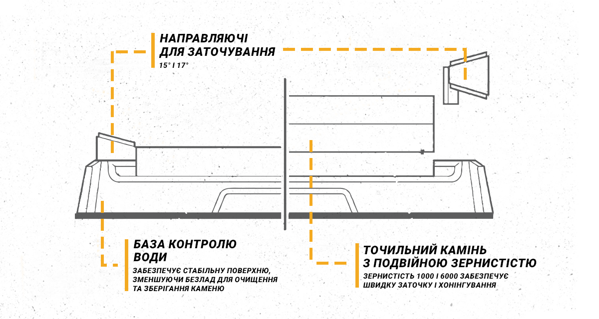 Протиковзкі ніжки забезпечують безпечний і стабільний процес заточування. Кутові напрямні забезпечують точність для збереження кромки, що прискорює і спрощує заточку.
