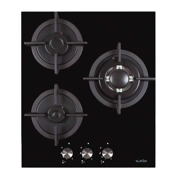 Тип поверхні - газова, загартоване скло, кількість конфорок - 3, Задня права 1.7 кВт, Передня ліва 2.9 кВт, Передня права 0.9 кВт, Управління - механічне, Газ-контроль - так, Електропідпал - так, Матеріал решіток - чавун, природний газ, бутан/зріджений, 220 В, Розміри ніші для вбудовування - 49 х 43.9 х 5 см, 7.3 кг, чорний