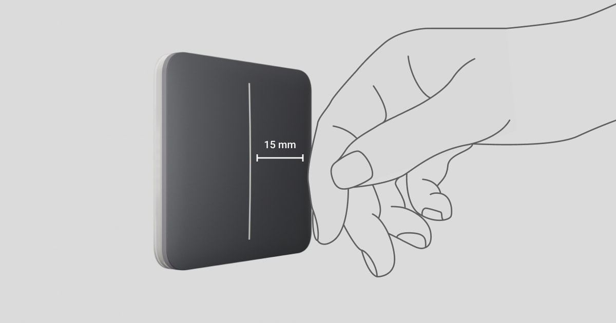 LightSwitch оснащений великою сенсорною панеллю, яка активується при наближенні руки на відстань 15 мм від кнопки. Інженери монтажу можуть пропонувати пристрої як рішення для громадських місць: керувати світлом можна брудними або мокрими руками та руками в рукавичках. LightSwitch оснащений підсвічуванням, яке виділяє вимикач у темряві. Підсвічування не яскраве, тому не заважатиме користувачам, навіть якщо вимикач встановлений у спальні біля ліжка. За потреби підсвічування можна вимкнути у програмі Ajax.
